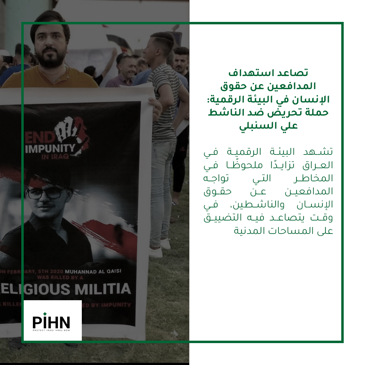إننا في حملة احموا المدافعين عن حقوق الإنسان في العراق الآن نؤكد تضامننا الكامل مع الناشط علي السنبلي، وندعو إلى التوقف الفوري عن استهداف المدافعين بسبب آرائهم، التي كفلها الدستور العراقي في المادة 38، التي تضمن حرية التعبير والطباعة والإعلان والإعلام والنشر بما لا يخل بالنظام العام والآداب.